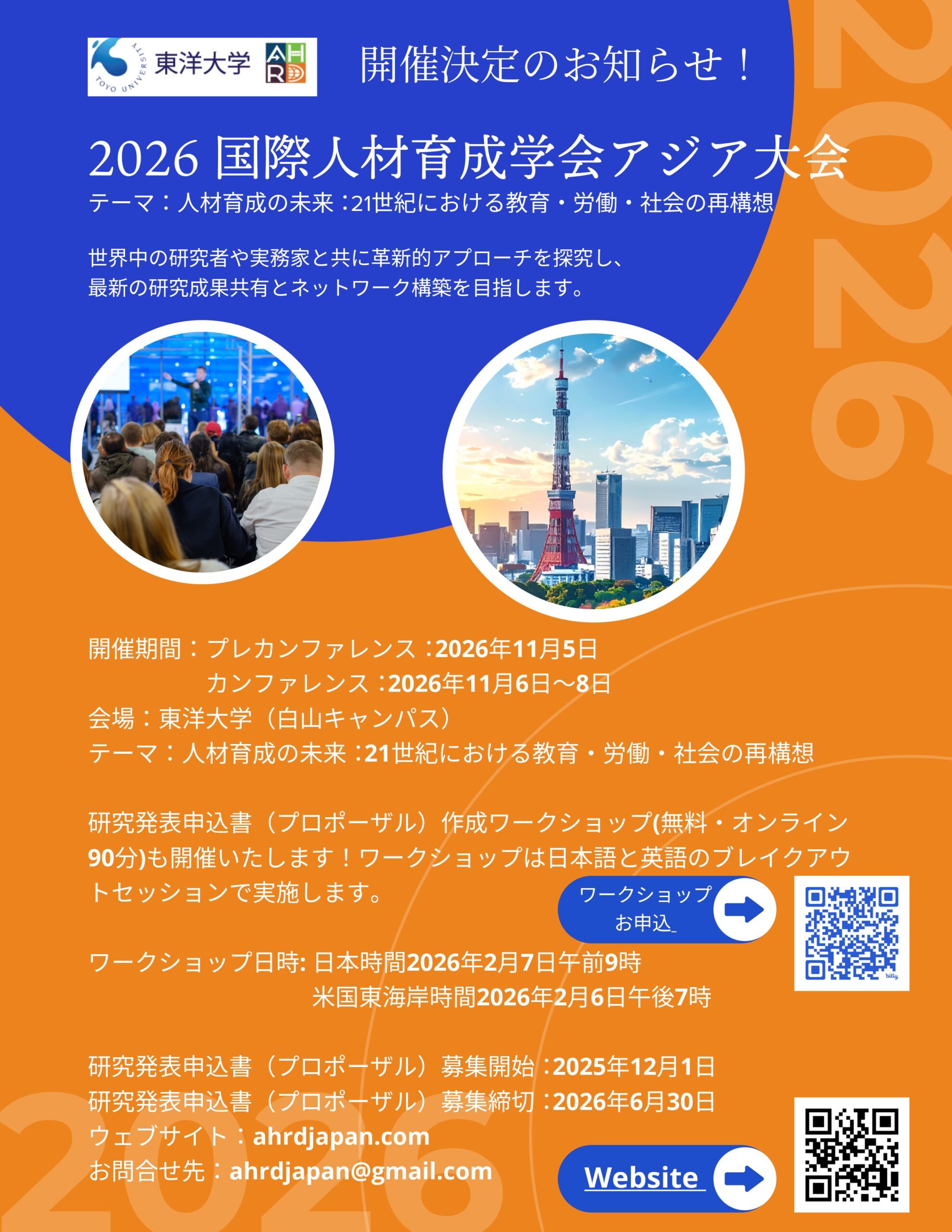 2026年11月6日~8日(5日は前日プログラム)に、Academy of Human Resource Development (AHRD:国際人材育成学会)第25回アジア大会を、東洋大学白山キャンパス(東京都文京区)にて開催いたします。