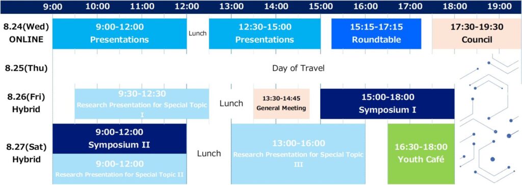 On the other hand, however, there are concerns about the re-spread of infection, and the outlook remains uncertain. Thus, unlike the usual schedule and format, we will hold “free research presentations” (general research presentations and thematic research presentations) and “round tables” only online (real-time interactive) on the first day (August 24). On the second day (August 26) and the third day (August 27), “Research presentations for special topics” “Symposium,” and “General Meeting” will be held both on-site (face-to-face) and online (videoconferencing system). Please see the Time schedule below.