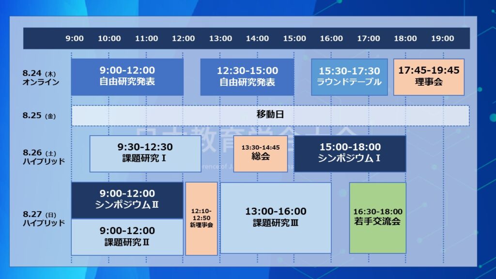 | 8月18日(金) | オンライン大会会場へのパスワード送付(大会参加申込者のみ) 『発表要旨集録』のオンライン大会会場より閲覧開始(大会参加申込者のみ) |