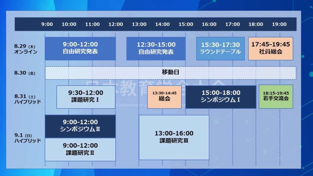 本大会も第81回・82回大会にならい、一日目(8月29日)はオンラインのみで「自由研究発表」(一般研究発表とテーマ別研究発表)と「ラウンドテーブル」を開催します。そして次の日(30日)に現地(名古屋大学)への移動日を設けて、二日目(31日)と三日目(9月1日)は現地会場(対面)とオンライン配信により「課題研究」「シンポジウム」「総会」を開催します。